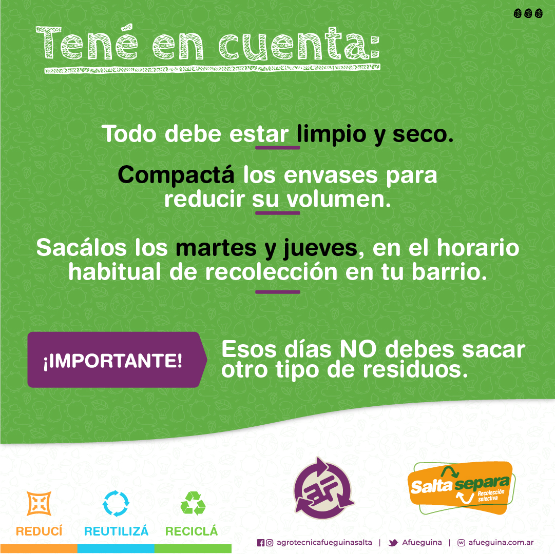 Desde hoy, todos los martes y jueves se recolectarán reciclables. La Municipalidad de Salta implementa en toda la ciudad el Sistema de Clasificación Selectiva de Residuos Secos “Salta Separa”. Agrotécnica Fueguina, la empresa encargada de la higiene urbana, ejecutará la recolección.
