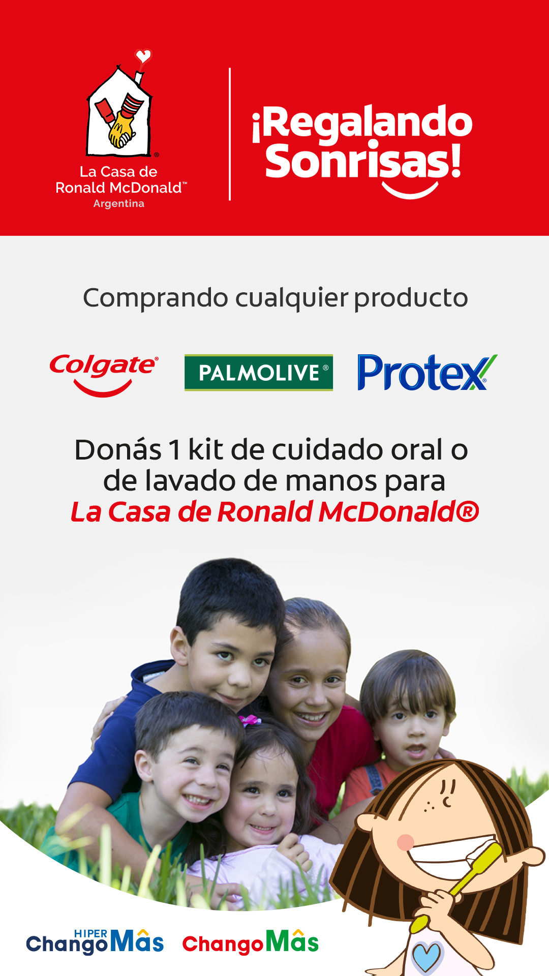 Durante todo julio, con la compra de cualquier producto de las marcas Colgate, Palmolive y Protex en las sucursales de Hiper ChangoMAS, ChangoMAS y en el sitio www.MASonline.com.ar, se donará un kit de cuidado oral y lavado de manos a La Casa Ronald.