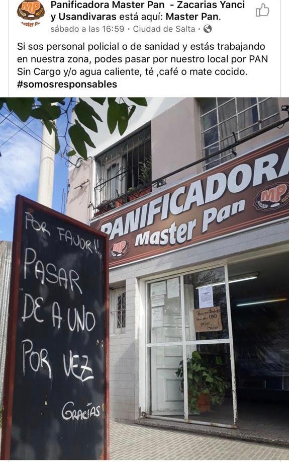 – Panificadora Master Pan: brinda pan gratuito para personal de salud o policial. Además, ofrecen una taza de té, café o mate cocido caliente. Dirección: Zacarías Yanci y Usandivaras.
