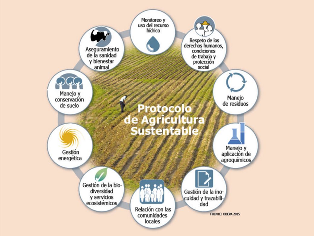 Dentro de los criterios de sustentabilidad abordados por el protocolo se cuentan: monitoreo y uso del recurso hídrico, condiciones de trabajo y protección social, relación con las comunidades locales y el aseguramiento de la sanidad y bienestar animal, entre otros. También se identificaron criterios más específicos a seguir y distintos niveles de gestión, que permitirán a los agricultores interesados en incorporar aspectos de la sostenibilidad, tener un avance gradual y visualizar cómo seguir en esa ruta.