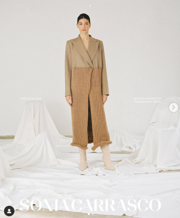 Carrasco elige proveedores que compartan sus valores. Cada tejido tiene un concepto detrás. Por ejemplo, el traje del monograma de la marca está hecho con hilo de algodón suprarreciclado y poliéster reciclado de botellas de plástico.