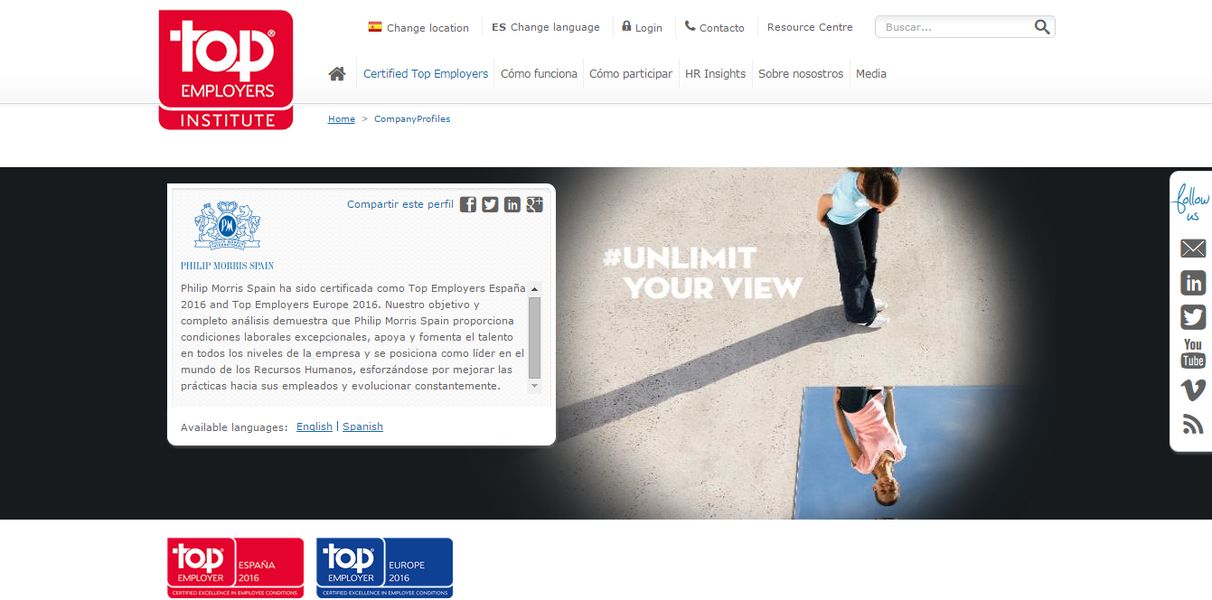 Philip Morris Spain ha recibido un año más la certificación “Top Employers”, que afianza su posición como empleador de referencia. El premio, otorgado por CRF Institute, contempla a aquellas empresas que alcanzan los estándares más altos de excelencia en las condiciones laborales que ofrecen a sus empleados.