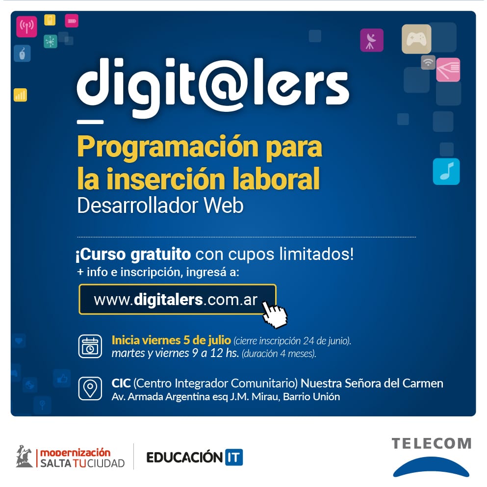 Telecom brindará los cursos de su programa digit@lers en Salta, para capacitar gratuitamente a jóvenes en lenguajes de programación. Esta iniciativa se hará en conjunto con la Municipalidad de Salta.