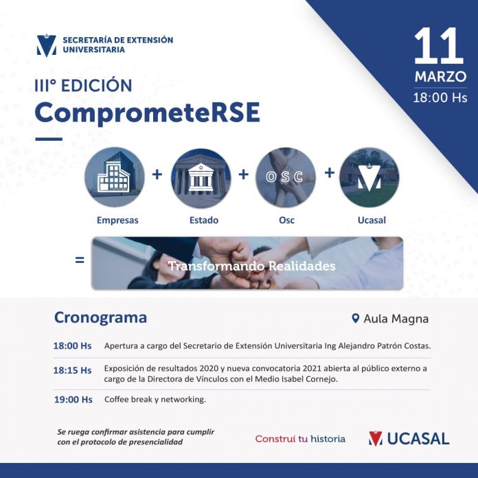 Otro punto que tiene especial relevancia es la vinculación con la comunidad externa a la Universidad, por ese motivo se desarrolla el evento ComprometeRSE, que convoca a representantes de empresas, organizaciones sociales, instituciones educativas a proponer ideas y armar equipos de trabajo para la presentación de proyectos. Para participar de este encuentro se requiere confirmar asistencia por mail a informes@ucasal.edu.ar o por teléfono al 0810555822725.